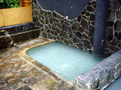露天風呂は6〜7人が入れる広さで、特に展望が良いわけでもないので半露天の内湯に入れば十分です。ここは何か妙に気に入ってしまいました。(2000/08/11/AM12:30) |
