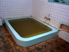 浴槽は4〜5人が入れる広さですが私は3人以内で入りたいです。湯は薄茶褐色で、鉄錆臭がかなり強いです。肌触りは鉄泉によくあるザラッとした感じではなく、さらりとした感触でとても心地の良いものです。湯上がり後も下着が茶色に染まるということもないです。とにかく浴室の雰囲気がとても良く、妙に心が落ち着く湯です。精神病にきくというのがわかるような気もします。また、加熱前の源泉はとても鉄錆臭が強いです。かなり強力です。洗面器に源泉を汲んでかぶろうとしましたが、あまりの冷たさに断念しました。 |